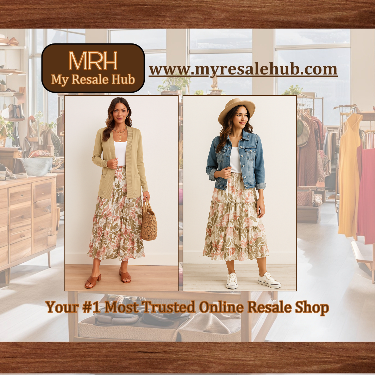 Easy, breezy, and perfect for spring — this floral tiered maxi skirt is one of those pieces you can dress up or down without thinking twice. Pair it with a cozy cardigan and block heel sandals for brunch, or throw on a denim jacket and sneakers for a casual weekend look. It’s proof that a good secondhand find can fit right in with your everyday style. With soft earthy tones, comfy layers, and a few affordable Amazon fashion picks like a straw bag and gold jewelry, this outfit is all about mixing pre-loved with new to create something fresh, stylish, and totally you.