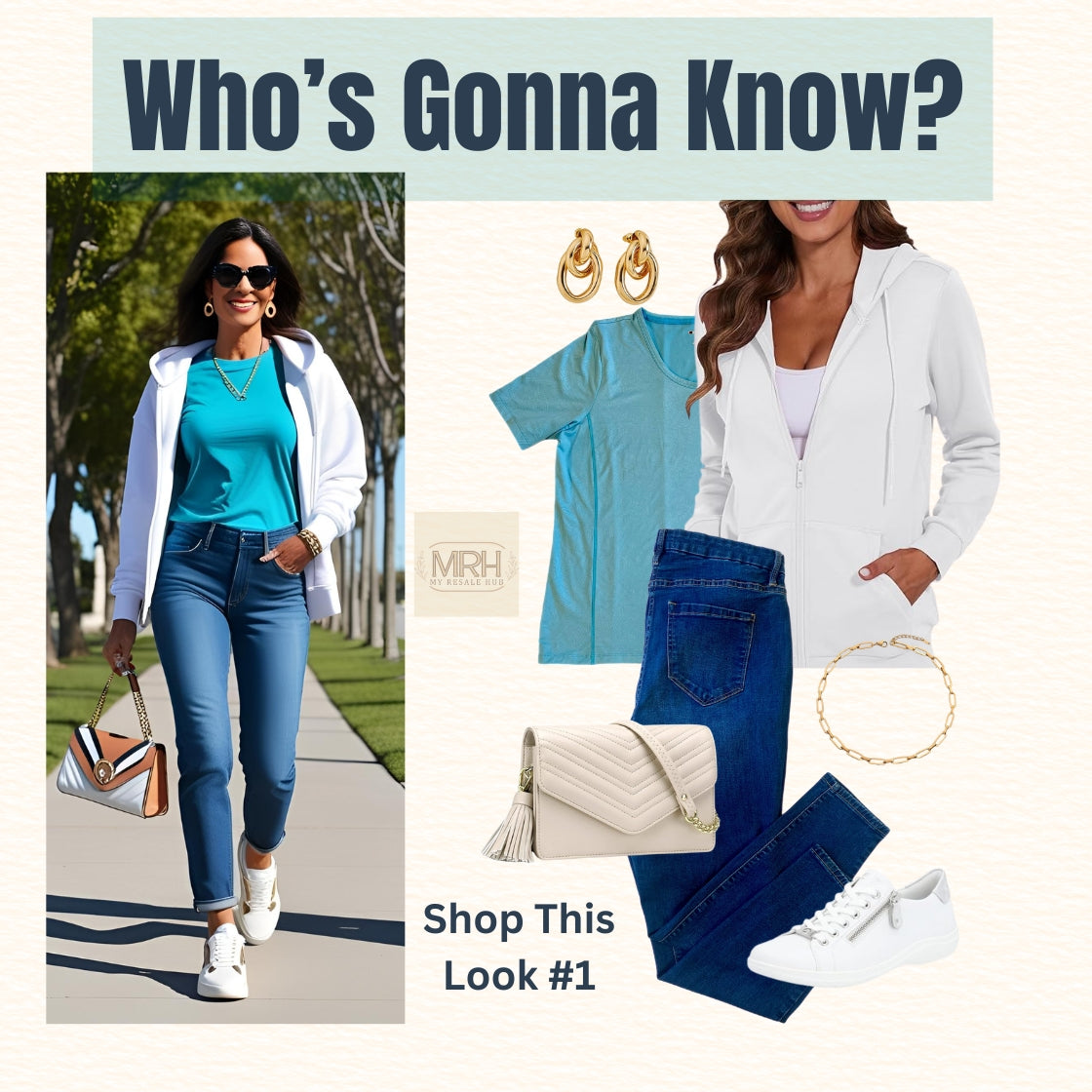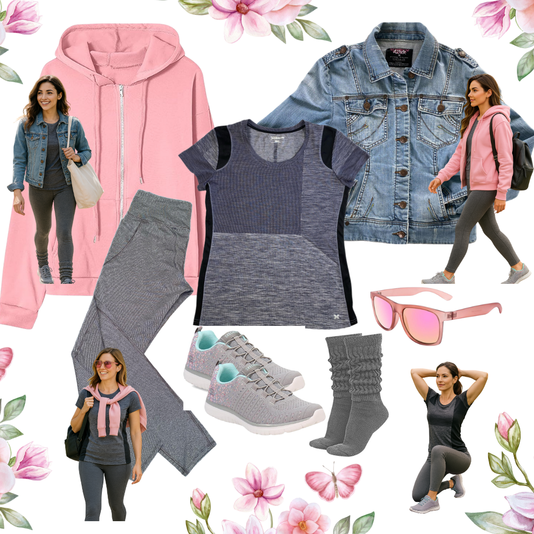 Whether you’re running errands, heading out for a sunny walk, or grabbing a weekend coffee, this layered look is all about ease and style. The mix of secondhand basics and affordable new finds gives it that effortlessly pulled-together feel — no overthinking required. Start with soft neutrals like a performance tee and leggings, then layer with a light denim jacket and a pink hoodie tossed over your shoulders for that easygoing spring vibe. Add in slouch socks, cozy Skechers, and rose-tinted readers, and you’ve got a look that feels fresh, functional, and totally you.