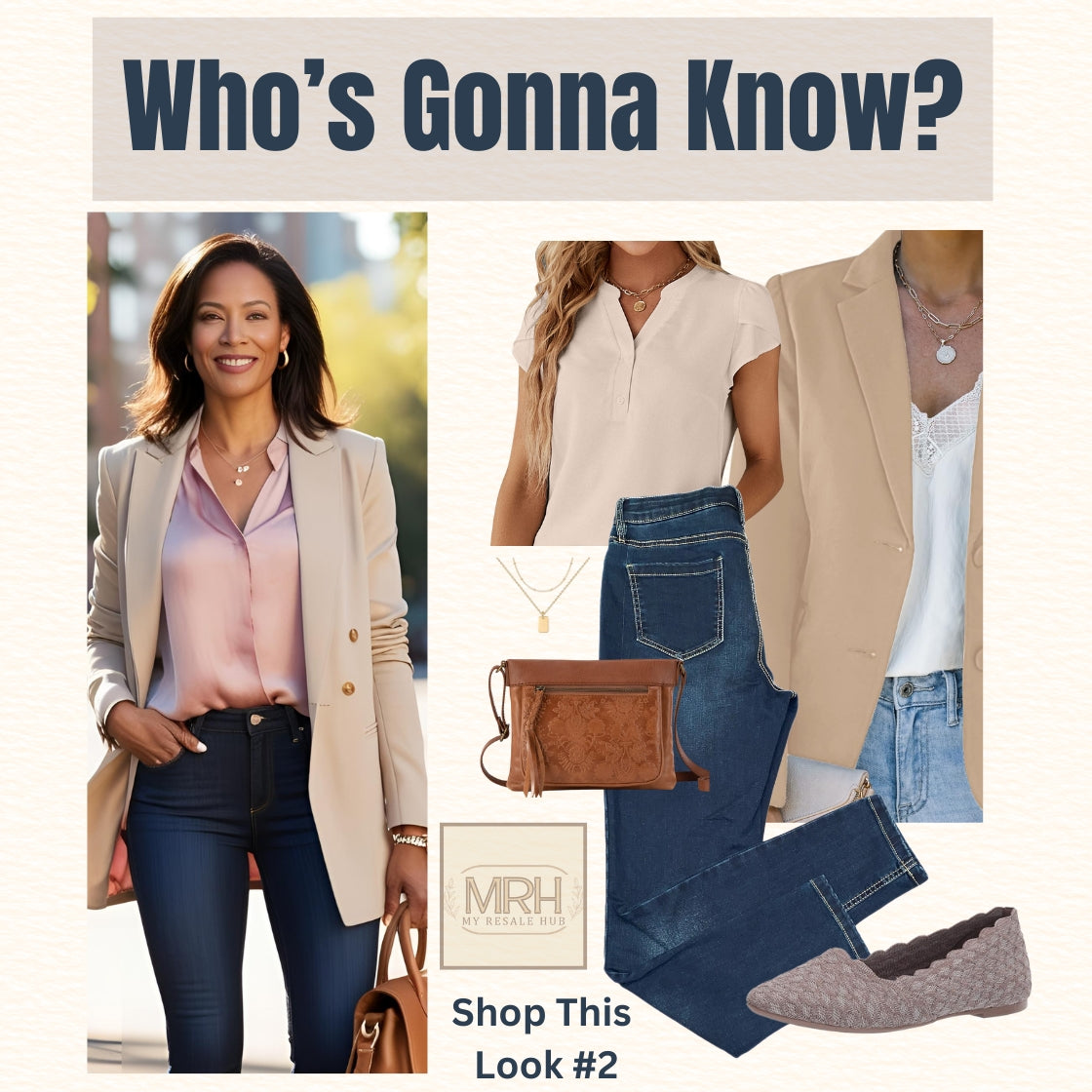 Classic new and pre-loved pieces come together for a polished yet relaxed look. Style doesn't have to be all brand new and it doesn't have to be expensive to look classy. These used skinny jeans pair perfectly with a blouse and a blazer, perfect for workdays, coffee dates or anywhere in between. Add in shoes and accessories from your closet and you have a timeless polished look that is uniquely yours!